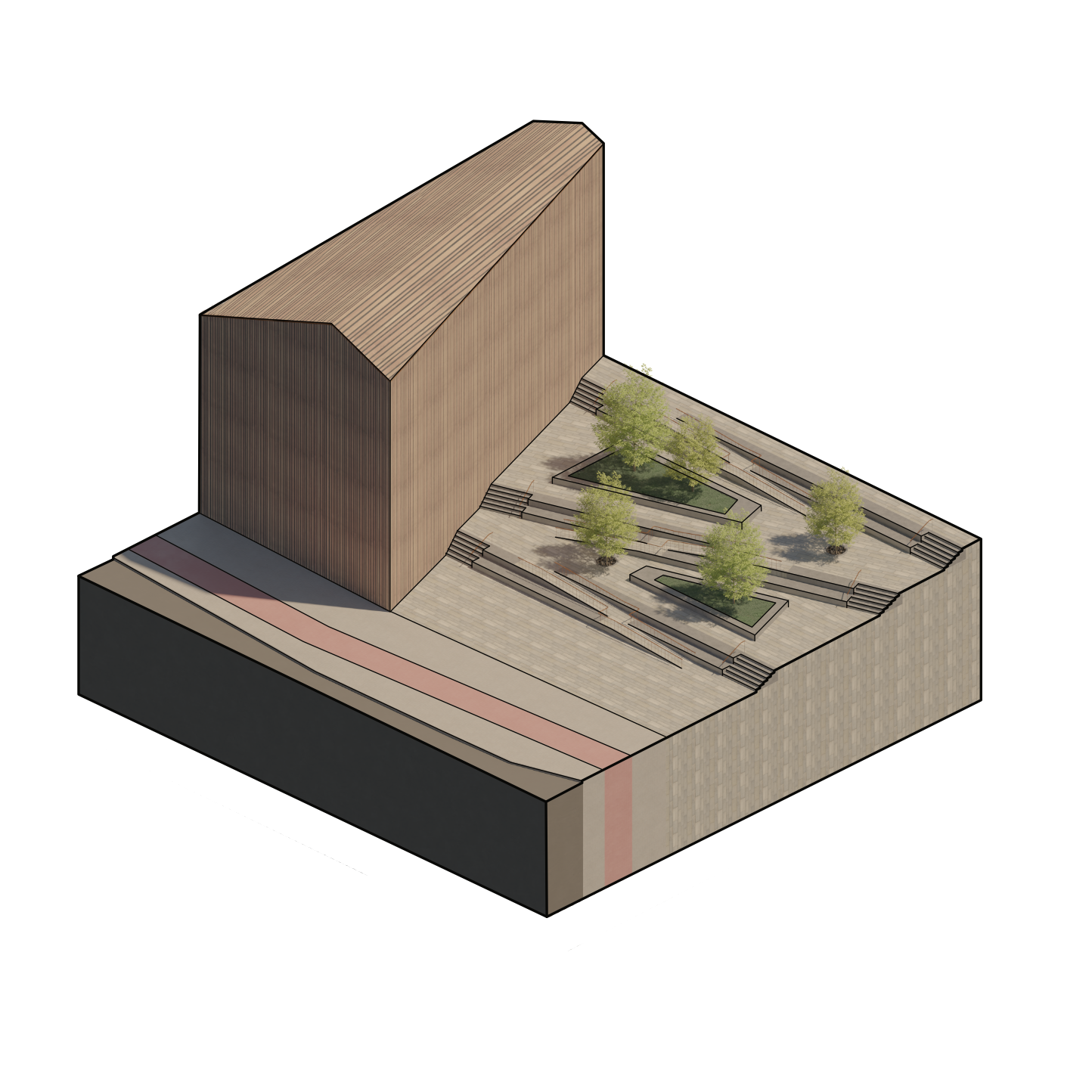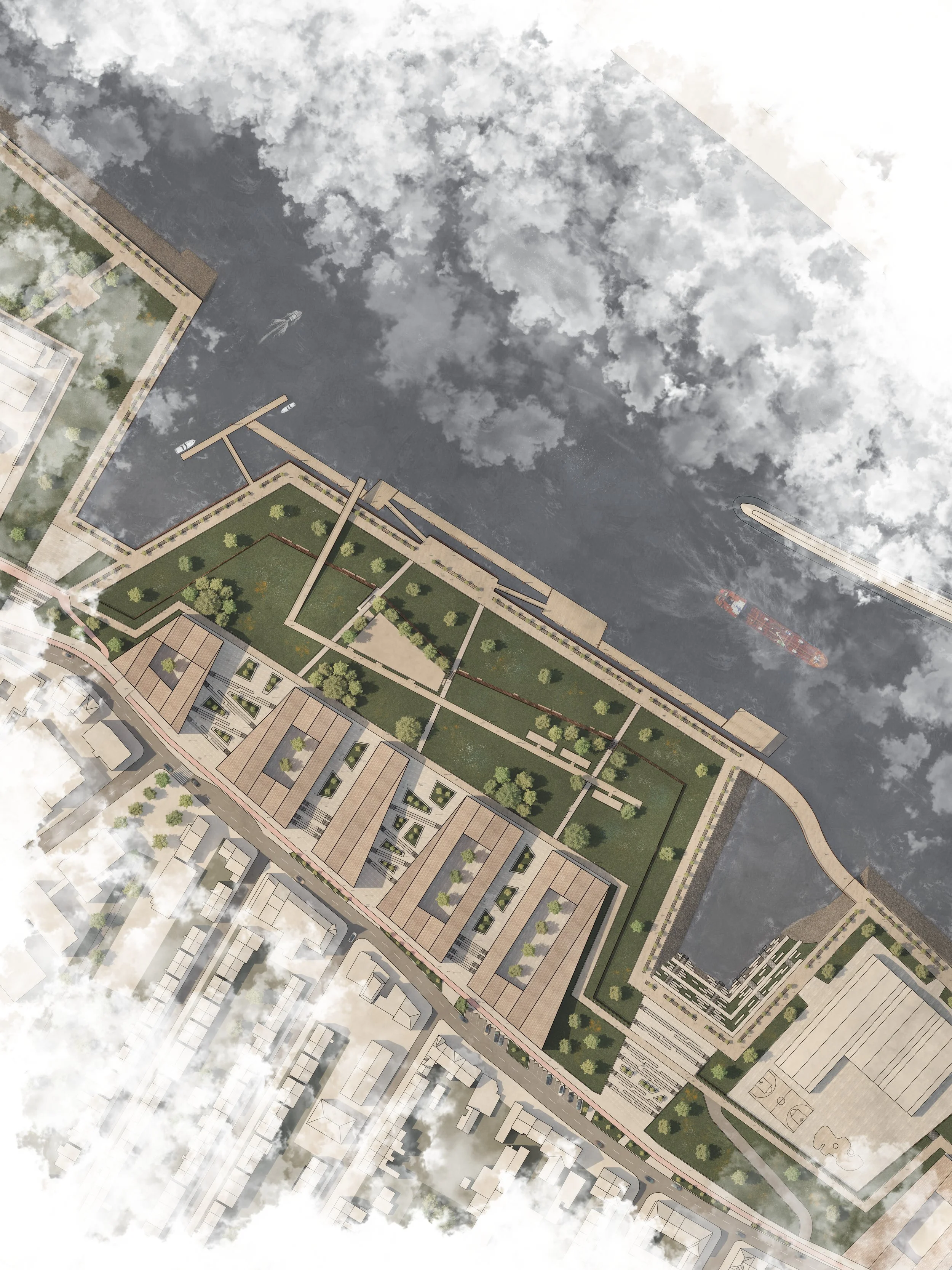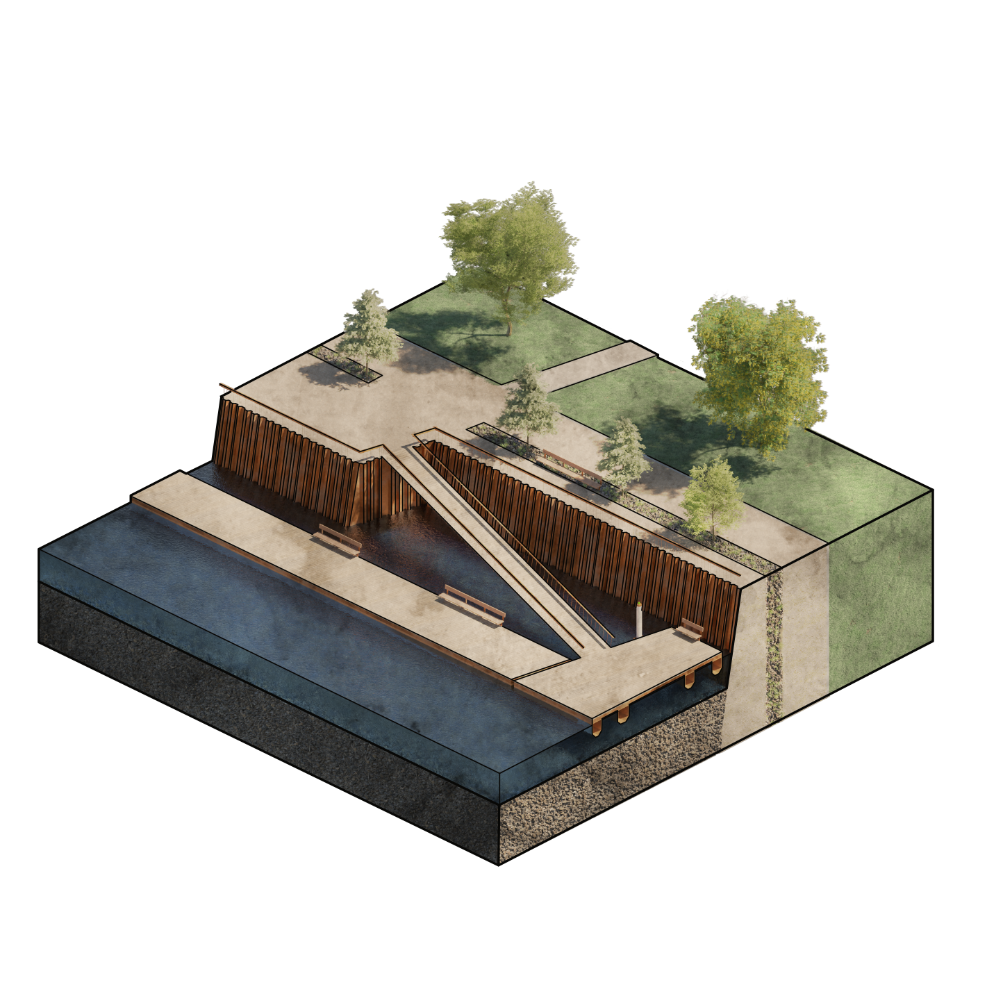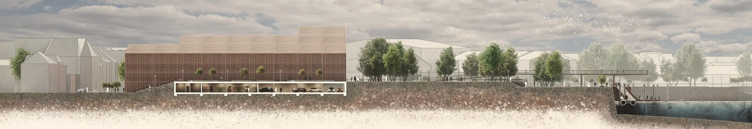 In Diesem Projekt wurde das Motiv der Spundwand, welche als Trennung zwischen Land und Fluss dient, als Gestaltungselement ausgearbeitet und sowohl im großen, als auch im kleinen Maßstab auf den Freiraum des Übergangs zwischen Woltmershausen und der Weser übertragen.